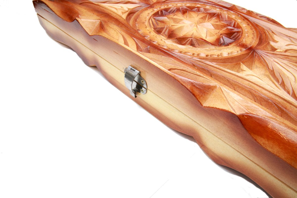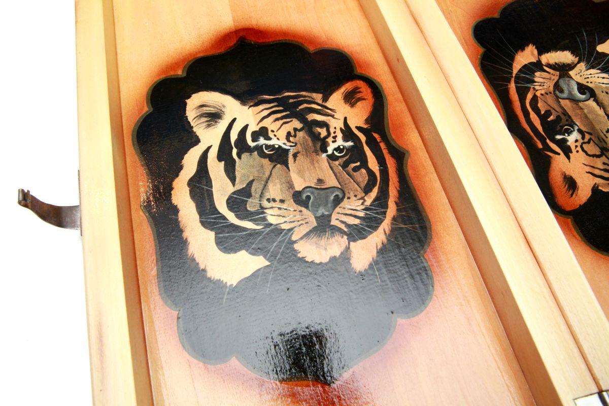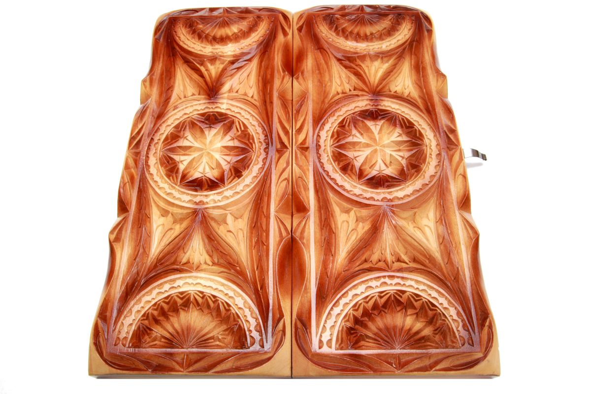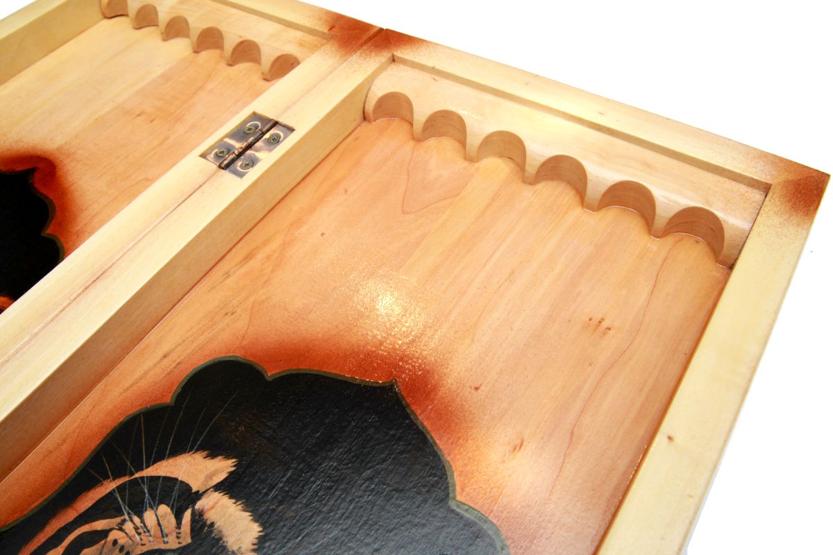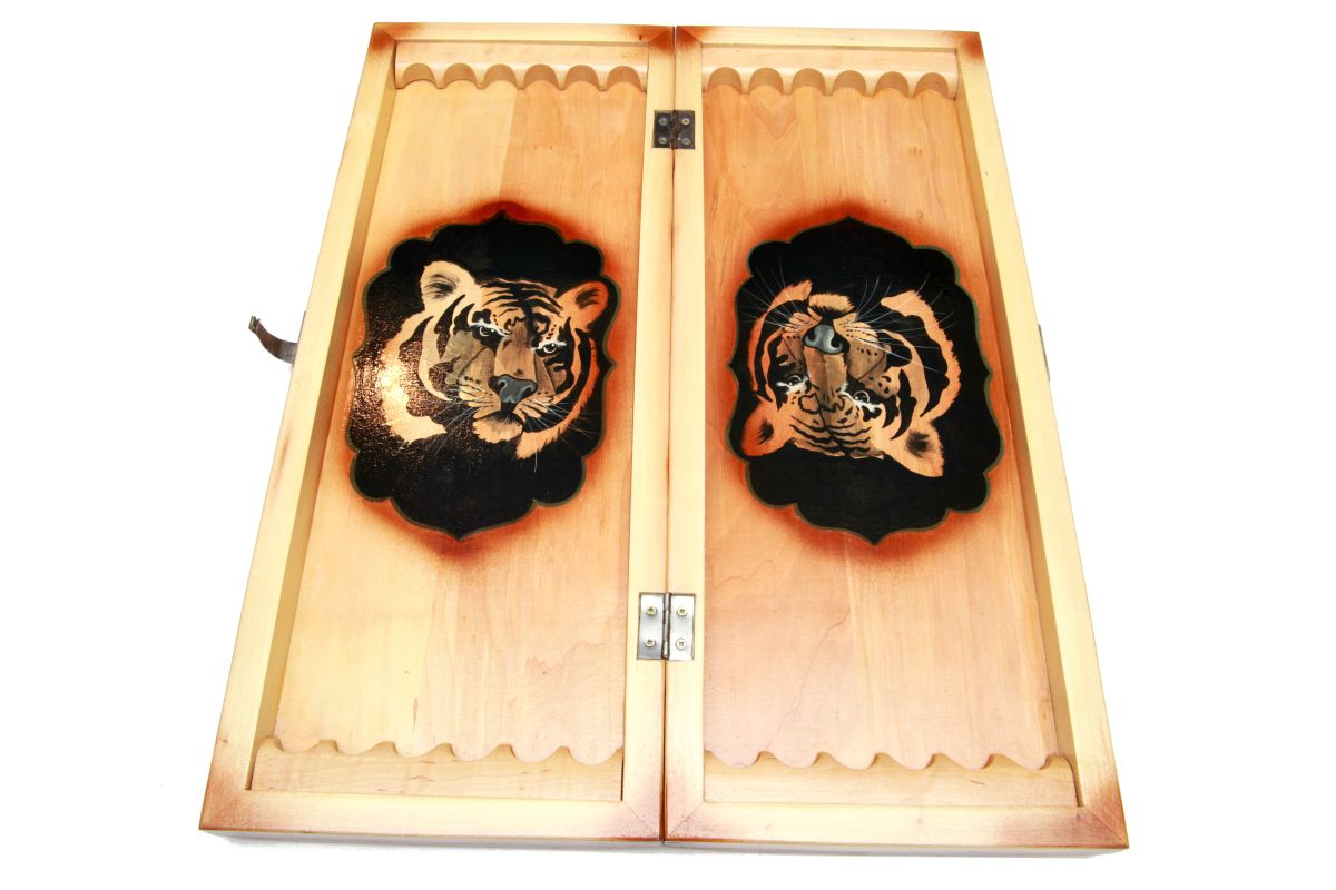 Можете сразу приступать к игре после покупки, поскольку к ней прилагаются фишки и кости. Это настоящее произведение искусства, которым занимались наилучшие мастера. На внутренней стороне доски, где игровое поле, нанесено изображение головы тигрицы. Внешняя сторона украшена орнаментами и узорами. Согласитесь, такой комплект приятно даже просто держать в руках, от него так и веет стариной, изысканным стилем. Размеры нард в закрытом виде составляют 64x25x9.6 см, а в открытом — 64x50x4.8 см.