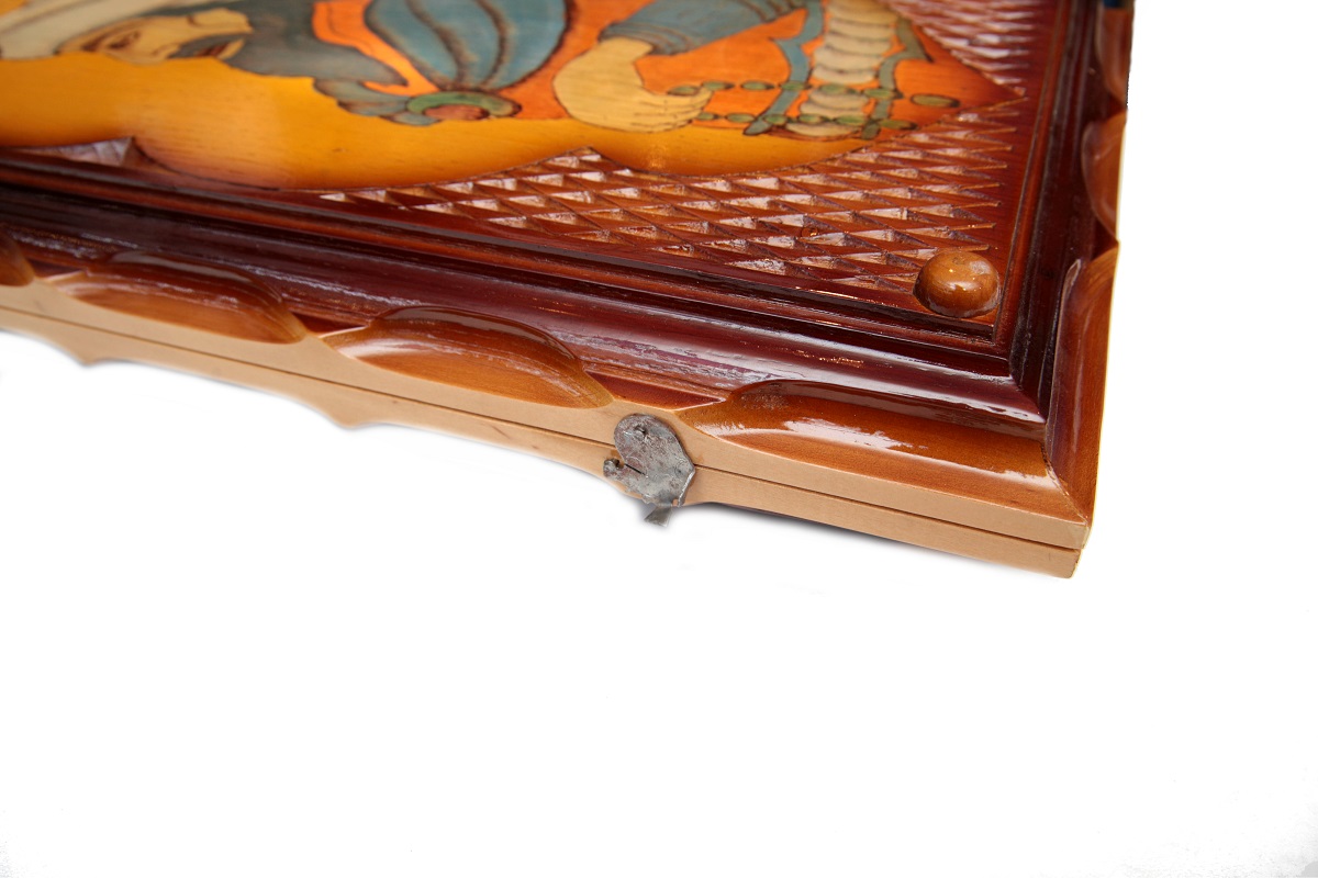 Глядя на мудреца, одетого с восточной роскошью, с камнями для игры в правой руке, сложно удержаться от нескольких партий в игру восточной знати и мудрецов. Ручная работа всегда стоила недешево, но нарды «Восточные» продаются по вполне приемлемым ценам. Геометрическая резьба, обрамляющая рисунок с восточным вельможей и чудесным замком в заоблачной выси подчеркивает изысканность стиля в оформлении.