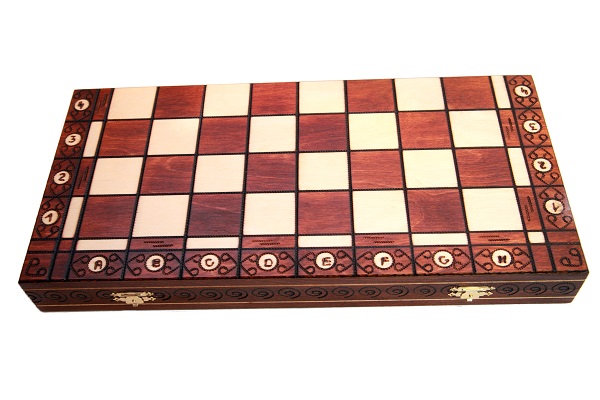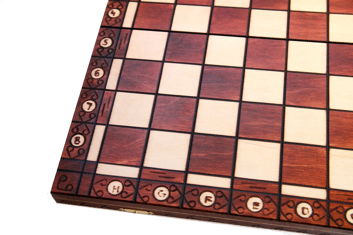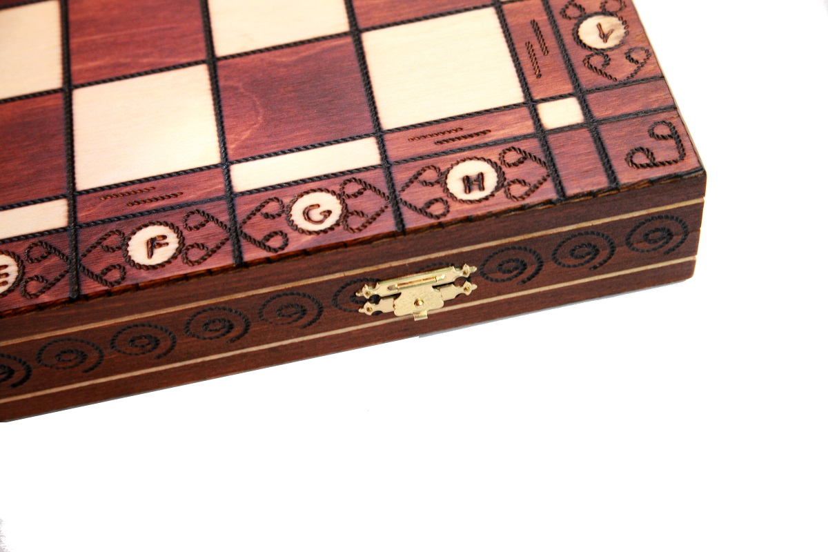 Шахматы «Амбасадор» отличаются качественной ручной работой и стильным органичным дизайном. Они изготовлены из цельной древесины, в основном, из породы карельской березы. Шахматная доска оформлена в сочетании светлых и коричневых тонов с выжженным аккуратным орнаментом, последовательно оплетающим игровое поле. Само поле классического стиля без узоров и рисунков. Все шахматные клетки окаймлены выжженной лентой. В раскрытом виде размеры доски равны 52х52х3 см, после складывания размеры уже составляют 52х26х6 см. Внутренняя сторона доски обита защитным войлочным бархатным сукном, где для каждой фигуры имеется своя индивидуальная ячейка для хранения. Во время переноса шахмат от их потери уберегают два ювелирных замочка, на которые закрывается внутренне содержимое шахмат.