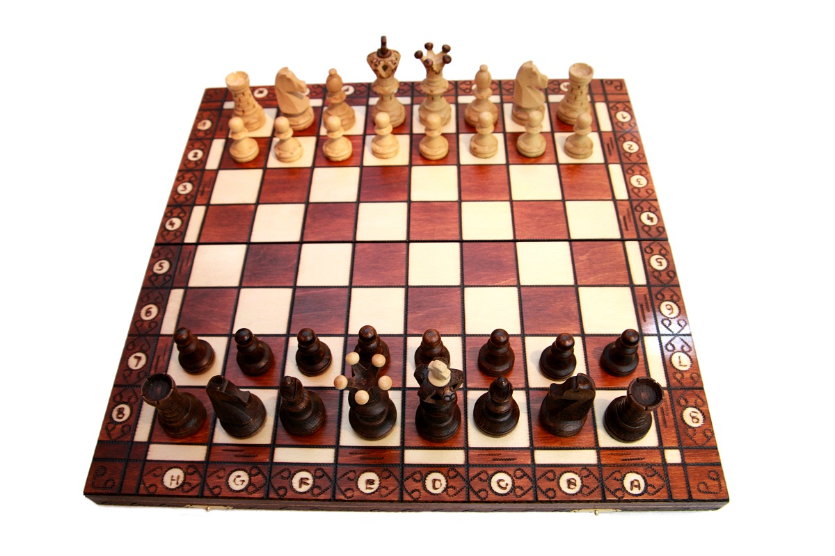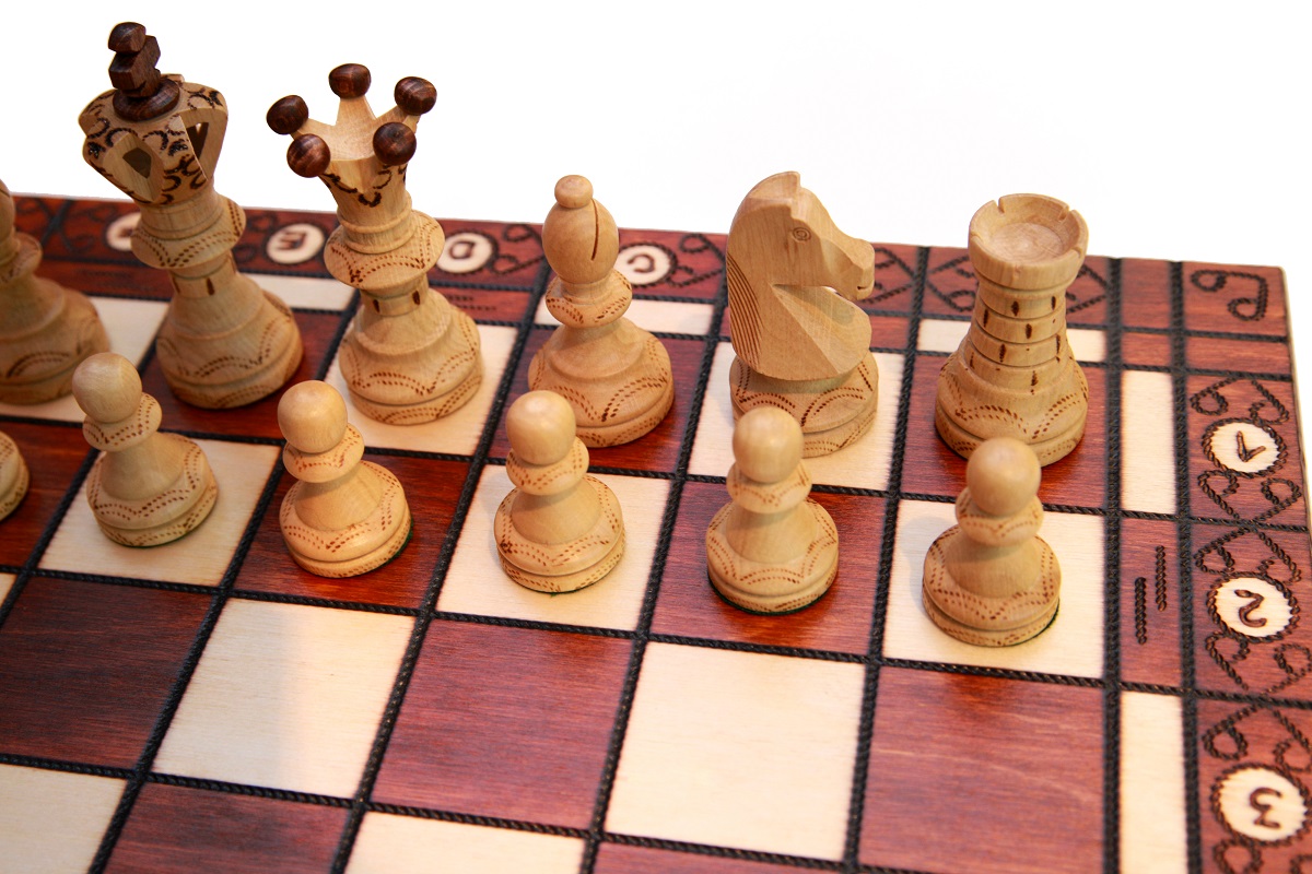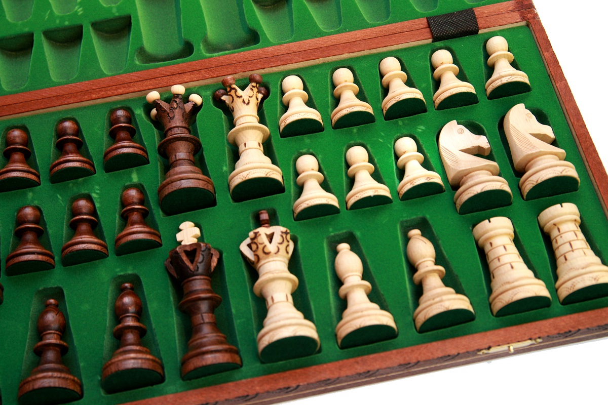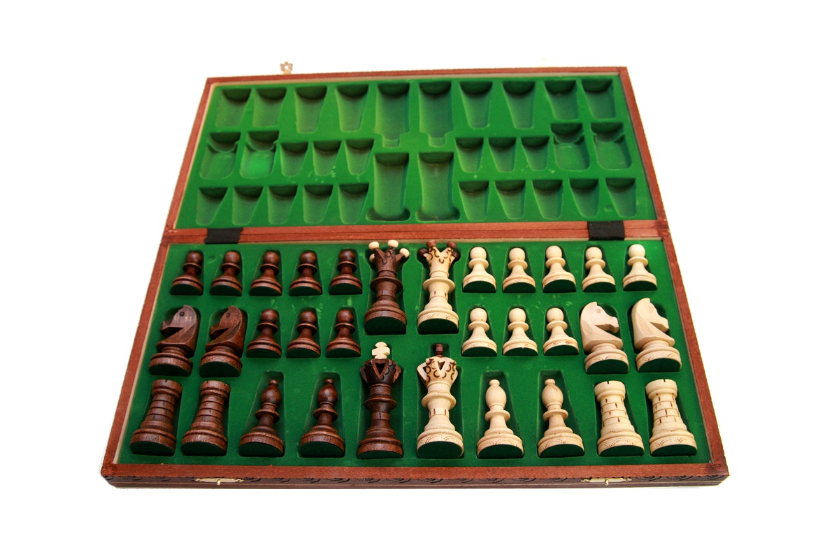 Шахматные фигуры в наборе содержат 32 штуки (16 светлых и 16 темно-коричневых фигур) неповторимого стиля, у фигуры офицера имеется прорезь в верхней части. Высота короля достигает 11 см, а высота пешки 5,3 см. По низу фигур и на воротниках имеются выжженный узор, напоминающий многоконечную звезду. У королевских фигур – узор идет по коронам и на «ожерелье». Корона также имеет сочетание светлого и темного цвета. У туры узор выжжен в виде кирпичной стены. Все фигуры выполнены из древесины, сверху покрыты матовым лаком. Основание фигур оклеено темно-зеленым войлоком. Он препятствует образованию царапин на игровом поле во время игры.