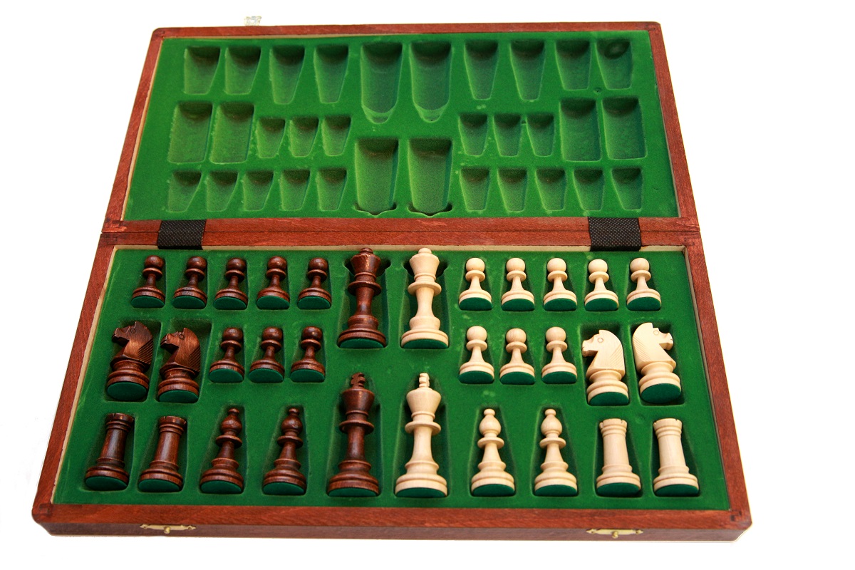 Без излишеств и узоров, что придает им традиционную красоту и благородство. Внутри каждая фигура содержит металлический утяжелитель, который придает им наибольшую устойчивость на игровом поле и удобство их расположения в руках игроков. Высота короля достигает 8 см, высота пешки равна 3,5 см. Фигуры (16 светлых и 16 темно-коричневых) покрыты качественным полуматовым лаком. Основание каждой фигуры покрыто зеленым войлочным сукном. Это необходимо для того, чтобы уберечь поверхность шахматной доски царапин, которые можно получить во время передвижения фигур.